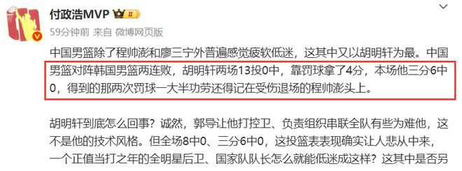 就连一向站在中国男篮这一边的媒体人付政浩也忍不住挖苦胡明轩,表示:中国男篮除了程帅澎和廖三宁外普遍感觉疲软低迷,这其中又以胡明轩为最。中国男篮对阵韩国男篮两连败,胡明轩两场13投0中,靠罚球拿了4分,本场他三分6中0,得到的那2次罚球一大半功劳还得记在受伤退场的程帅澎头上。