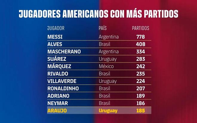 在与皇家马德里的国家德比中,阿劳霍完成巴萨生涯第185次出场,这位乌拉圭中卫距离跻身巴萨队史南美球员出场榜前十只差1场。
